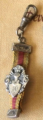 The item in the image appears to be a small decorative medal or charm featuring a knight's helmet above a shield with the letter "H" on it, attached to a red and yellow striped ribbon with a clasp at the top.
