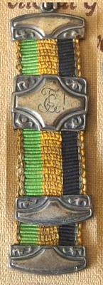 The item in the image is a small decorative medal or ribbon bar with a green, yellow, and black striped ribbon and silver clasps. The central clasp has the letters "EC" engraved on it.
