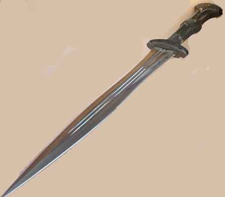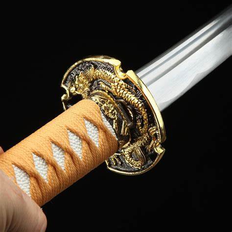 type of katana or Japanese-style sword, characterized by its wrapped handle and ornate guard (tsuba). The guard features a detailed dragon design, which is a common decorative motif symbolizing power, strength, and protection in East Asian cultures. The handle is wrapped in a traditional style, often with cord or leather, providing both grip and aesthetic appeal.