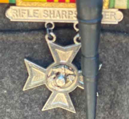 The medal in the image is a United States Marine Corps (USMC) Rifle Sharpshooter Badge.
