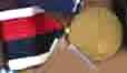 The item in the image appears to be a small decorative medal or charm featuring a knight's helmet above a shield with the letter "H" on it, attached to a red and yellow striped ribbon with a clasp at the top.